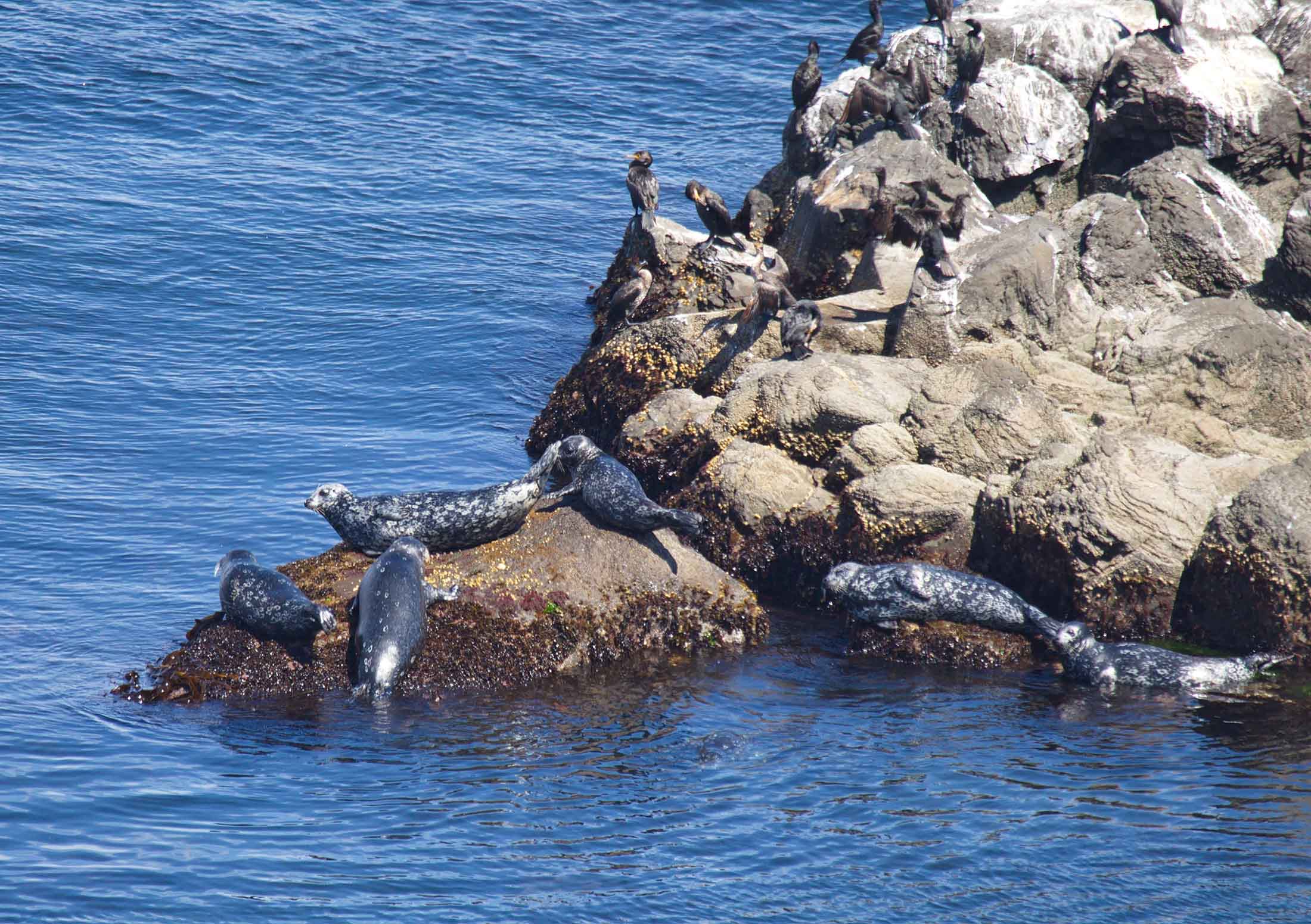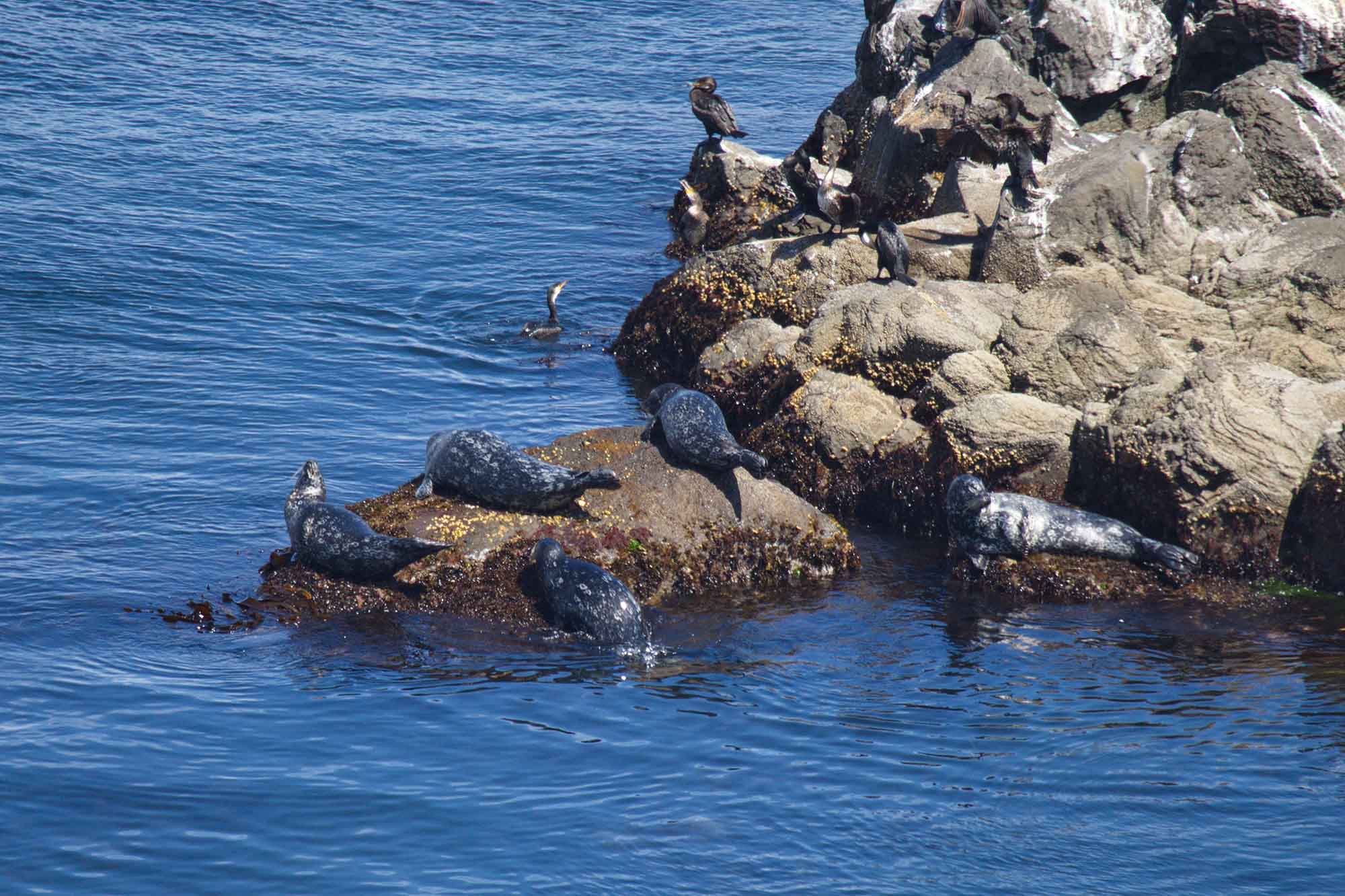 День выдался очень солнечным, а море спокойным. Рядом с антурами на камнях также расположились представители еще одного краснокнижного вида - японские бакланы (Красная книга Сахалинской области).
