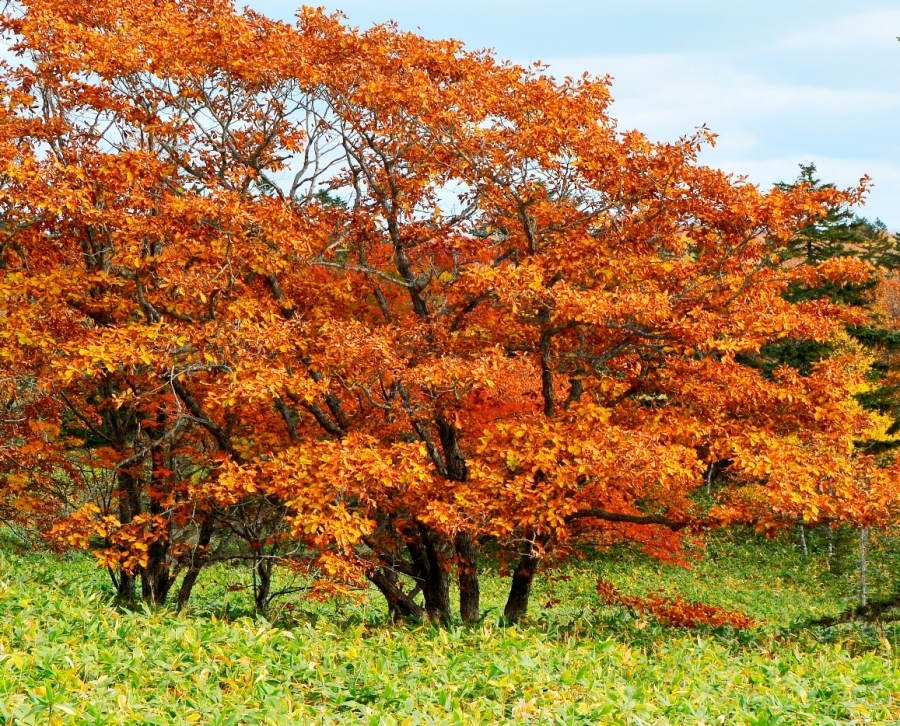 Дуб курчавенький (Quercus crispula) на юге о. Кунашир. Автор фото: Александр Яковлев. Фенологические явления подсезона «Глубокая осень»: переход среднесуточных температур ниже +10˚С, первые твердые осадки, начало осенней линьки у зайца-беляка и лисицы обыкновенной, полная осенняя раскраска древесного и кустарникового яруса.