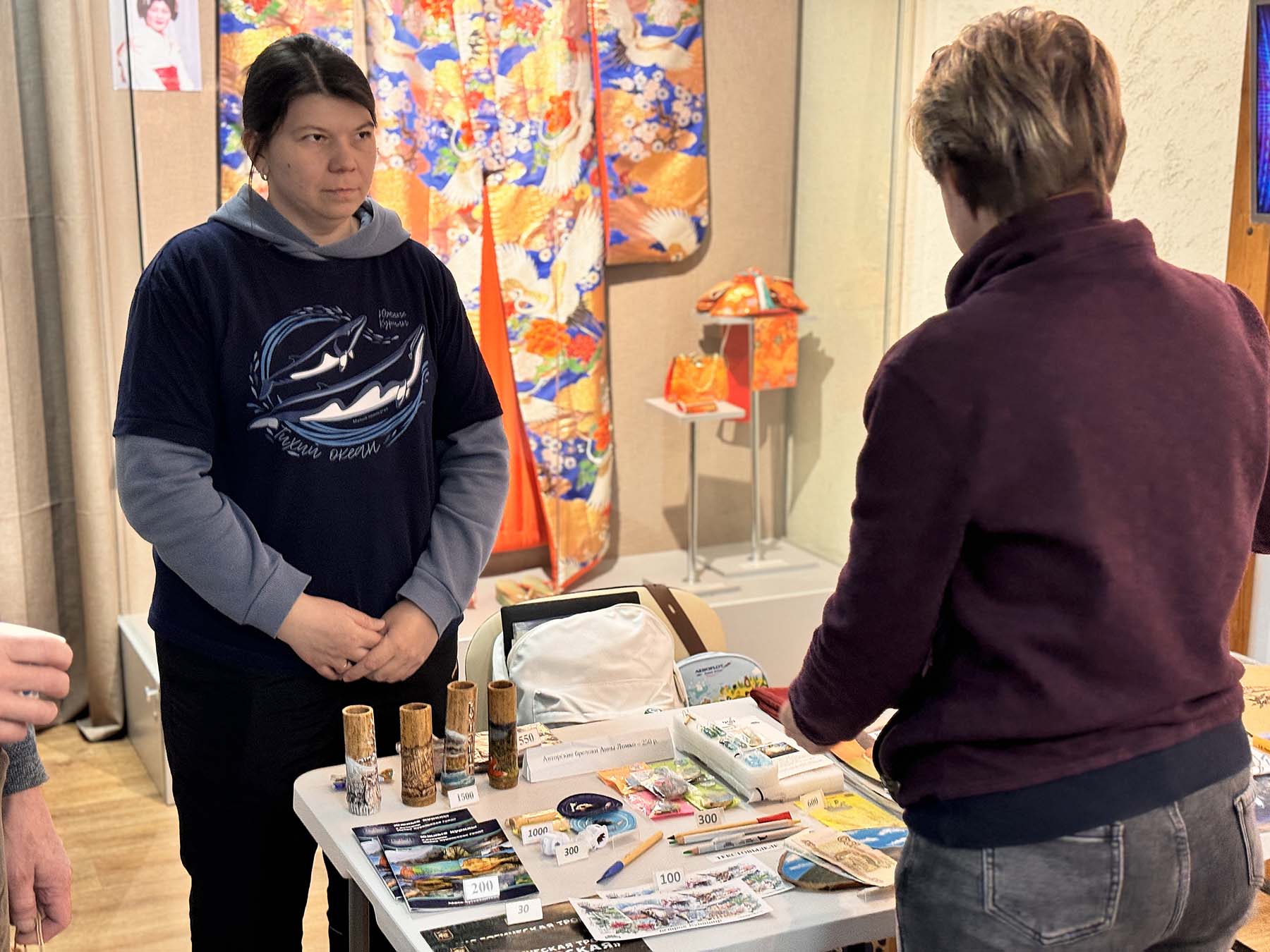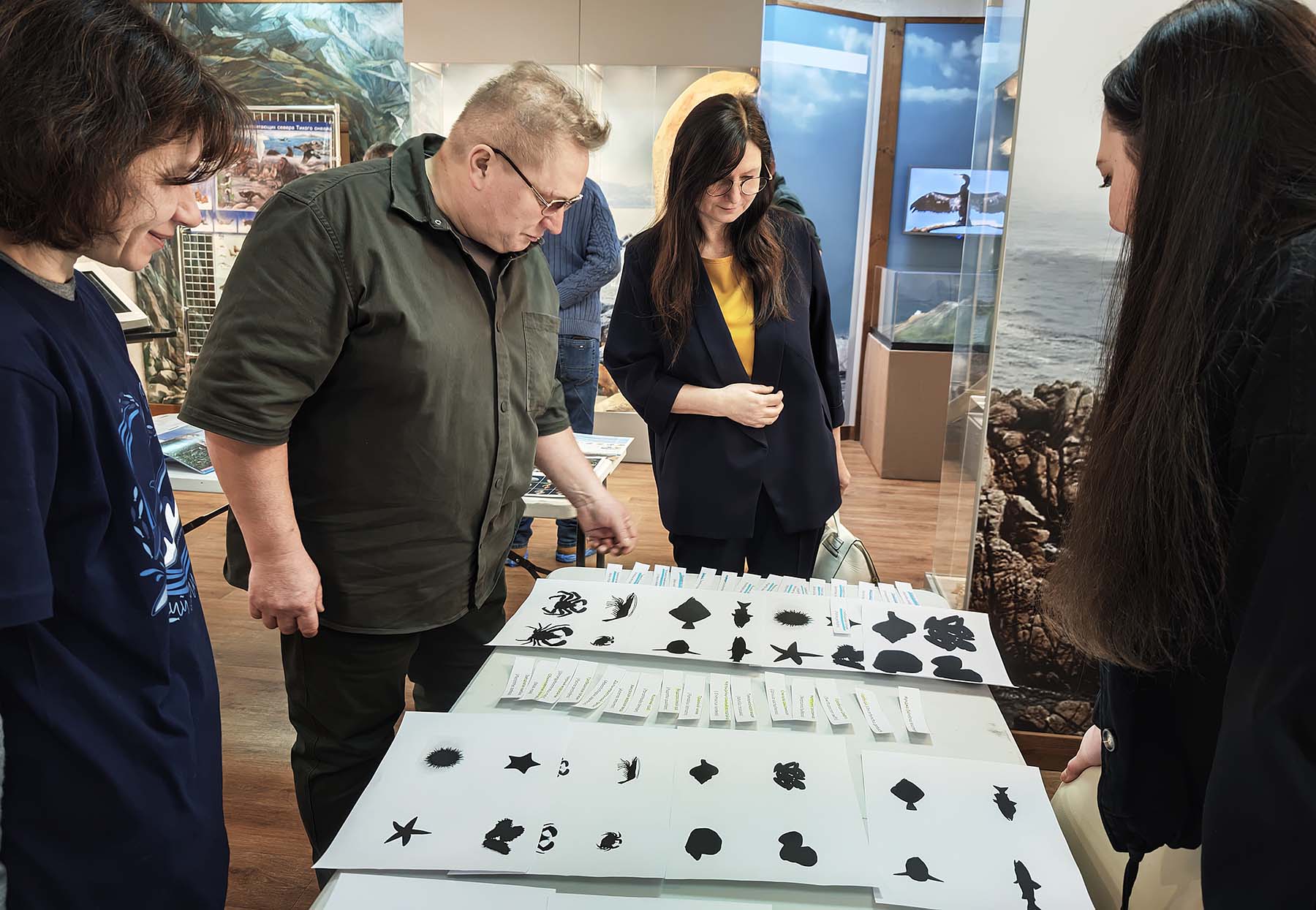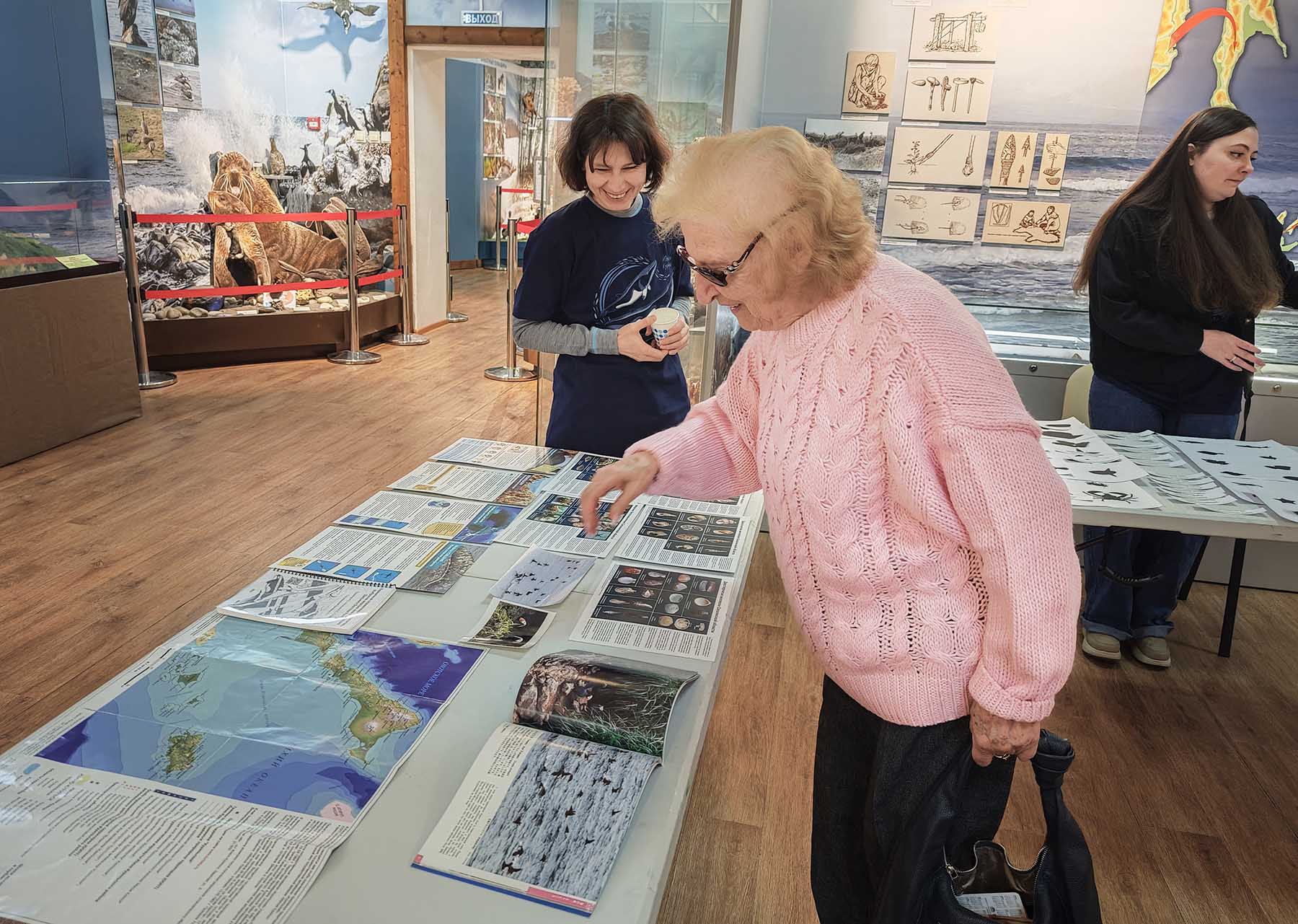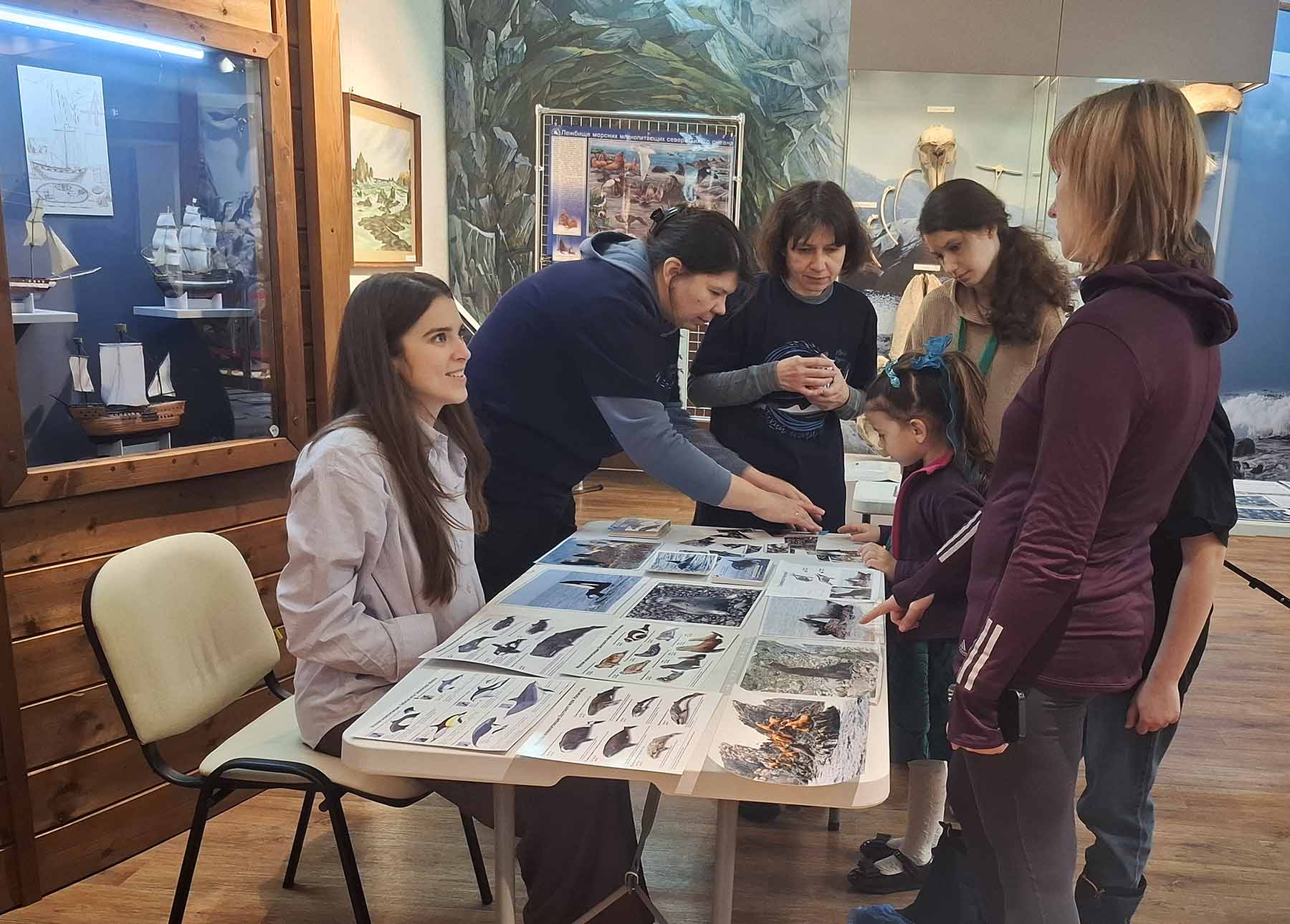 Вдохновение в деталях: гости праздника изучают эколого-просветительские материалы о морских млекопитающих Южных Курил. 14.02.2026. Автор фото: Полина Антонова.