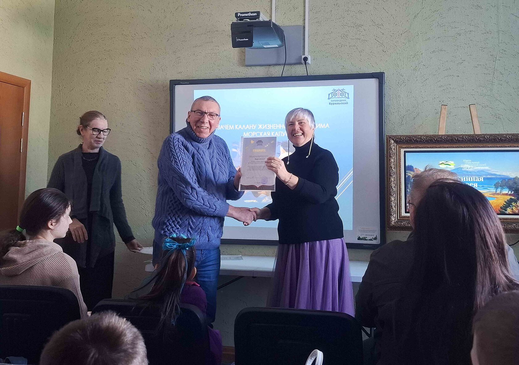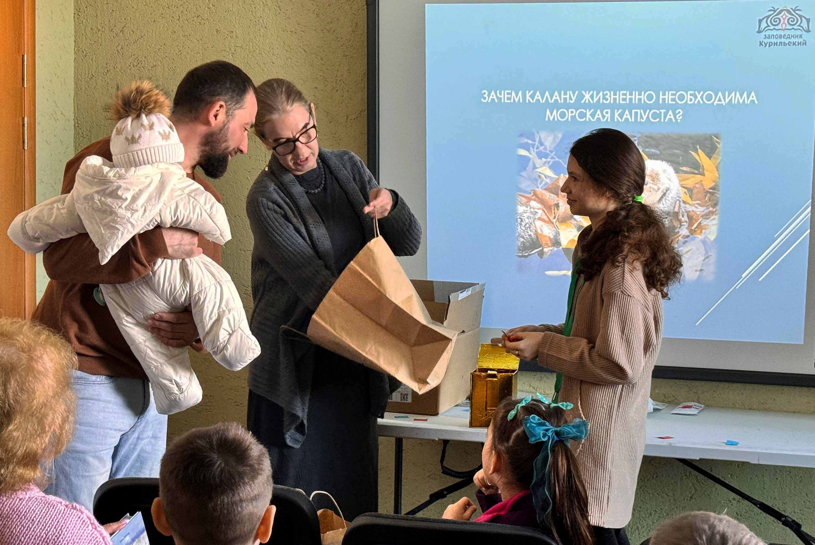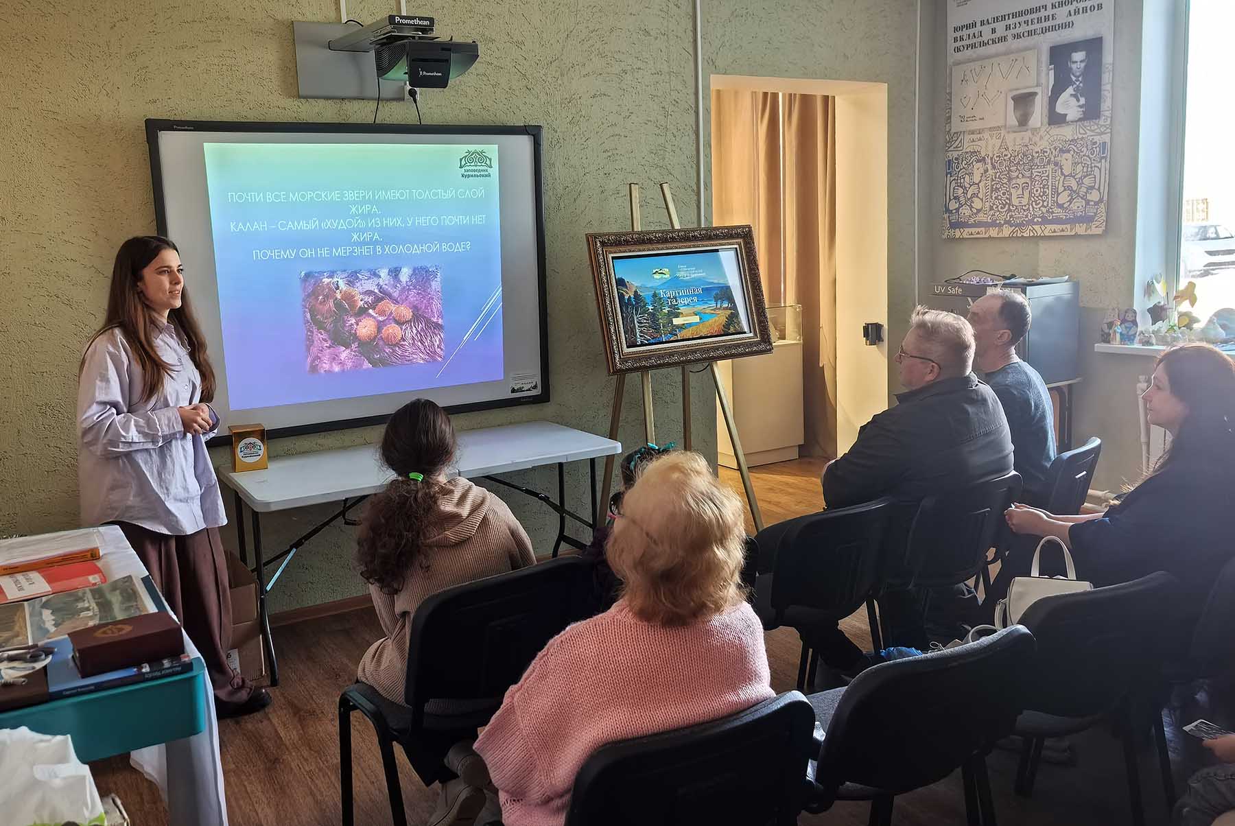 Также специалист по связям с общественностью заповедника Мария Наумова в субботу, 14.02.2026, провела занятие для учеников старших классов МБОУ «Центр образования пгт Южно-Курильск». 18 ребят и их педагоги узнали о деятельности заповедника по охране морских акваторий. Особое внимание было уделено калану (морской выдре).