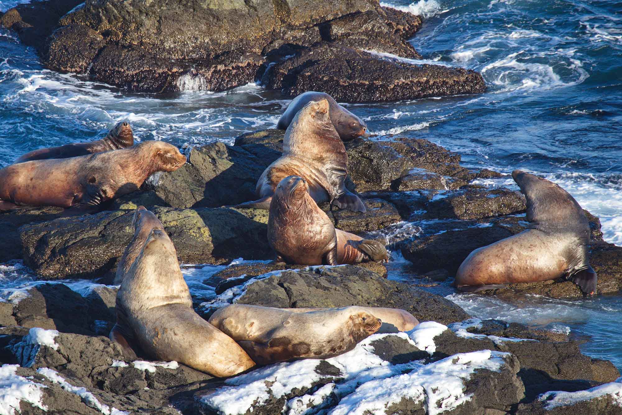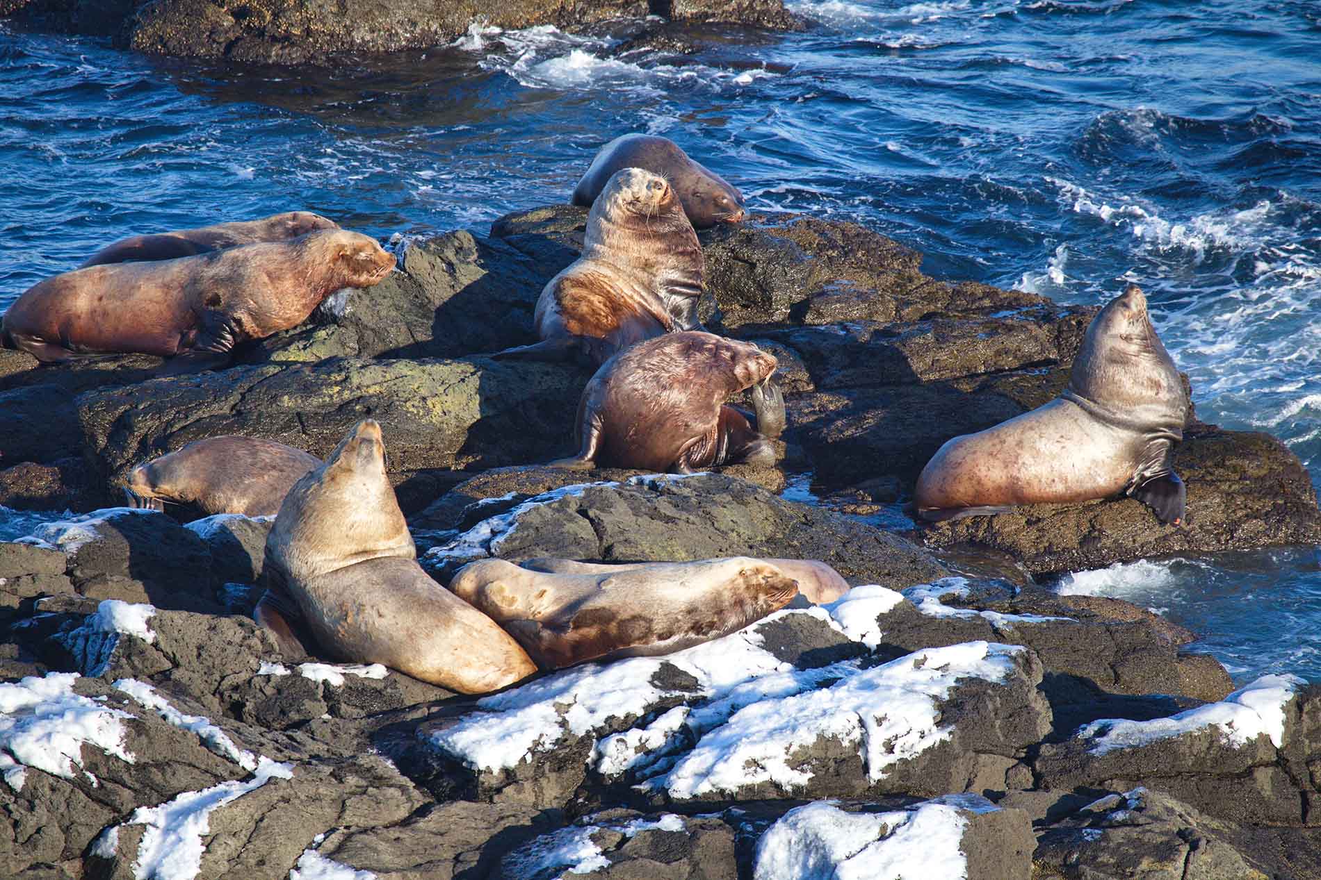 Крупные самцы си́вучей занимают лучшие места на скалах, демонстрируя свою мощь и статус даже во время сна. Остров Кунашир, окрестности Южно-Курильска. 24.01.2026. Автор фото: Сергей Стефанов.