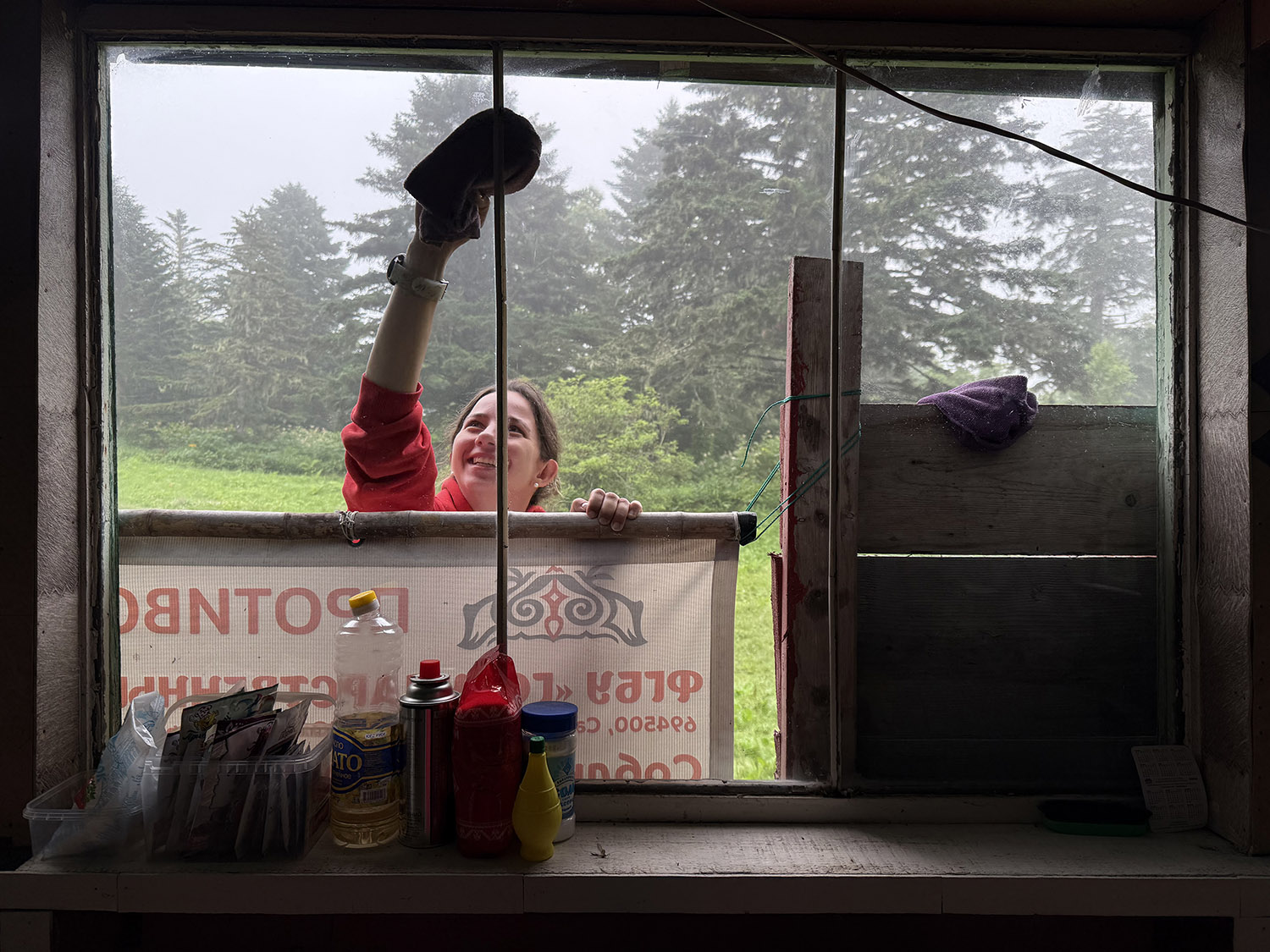 Волонтёр из Красноярска Татьяна Рожина моет окна кордона «Саратовский» на Северном участке заповедника «Курильский». Автор фото: Анна Берлякова.