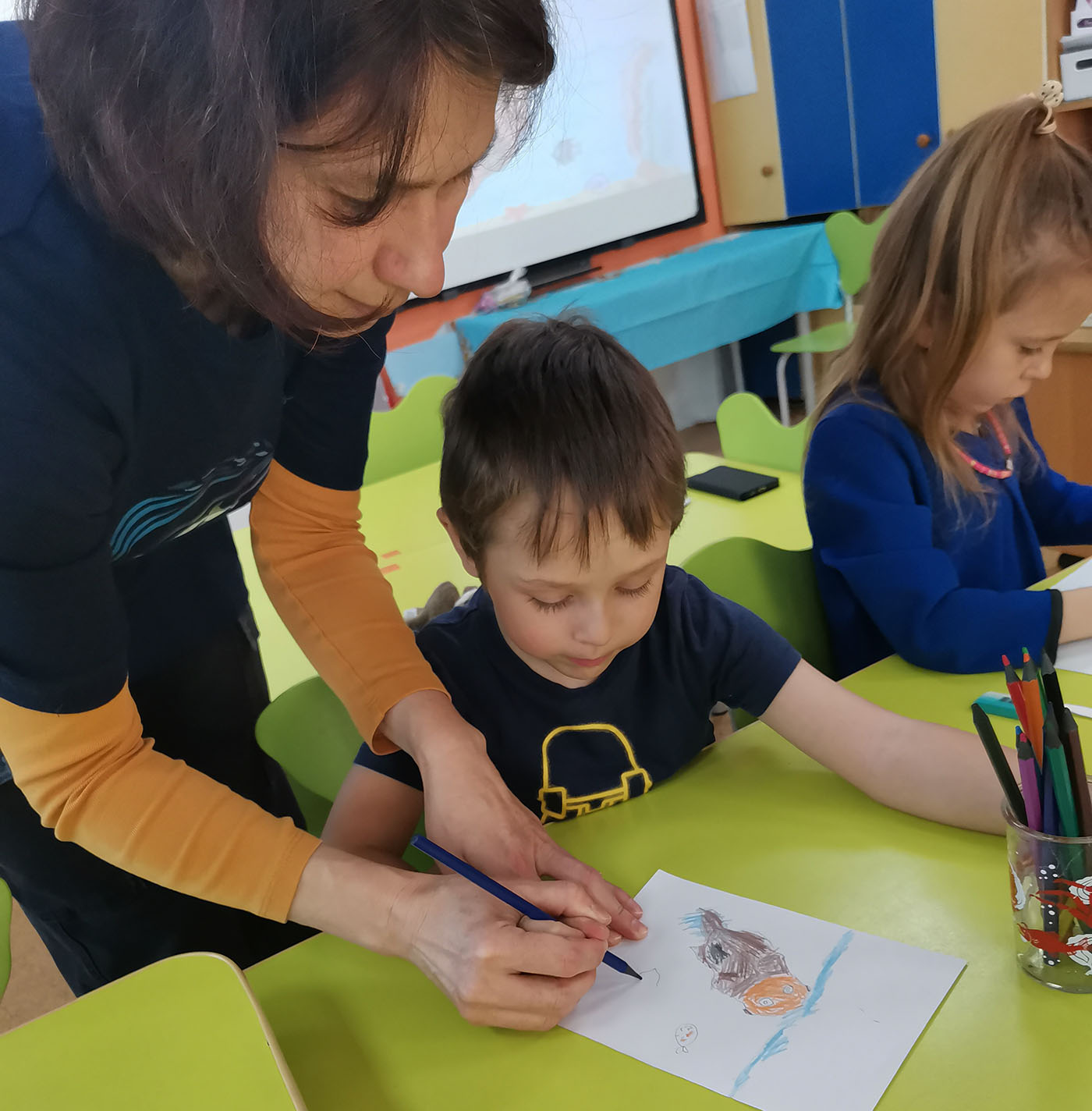 Во время него дети узнали, как выглядит это морское млекопитающее, как передвигается, где обитает, а затем закрепили новый для них материал, нарисовав плывущего в море калана, используя подготовленные шаблоны животного. Малыши с удовольствием подрисовывали плывущих рядом с каланом рыбок, обитающих на дне морских ежей, морских звёзд и водоросли.