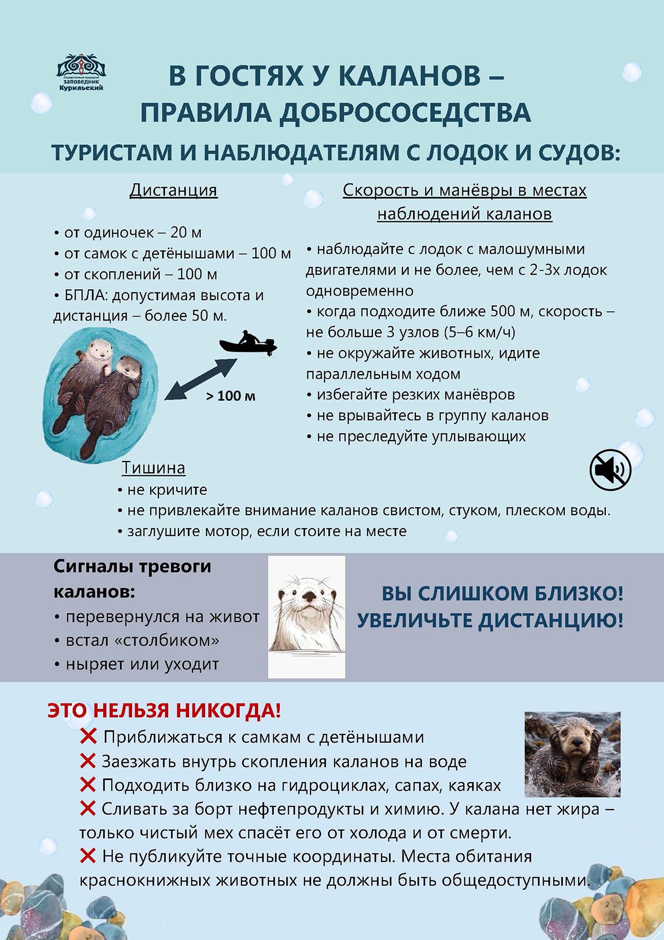 Сотрудники заповедника «Курильский» начали проводить эколого-просветительские мероприятия в рамках гранта Президента РФ по теме «Калан» и подготовили краткую памятку для наблюдателей - тех, кто окажется в местах обитания калана и других морских животных.
