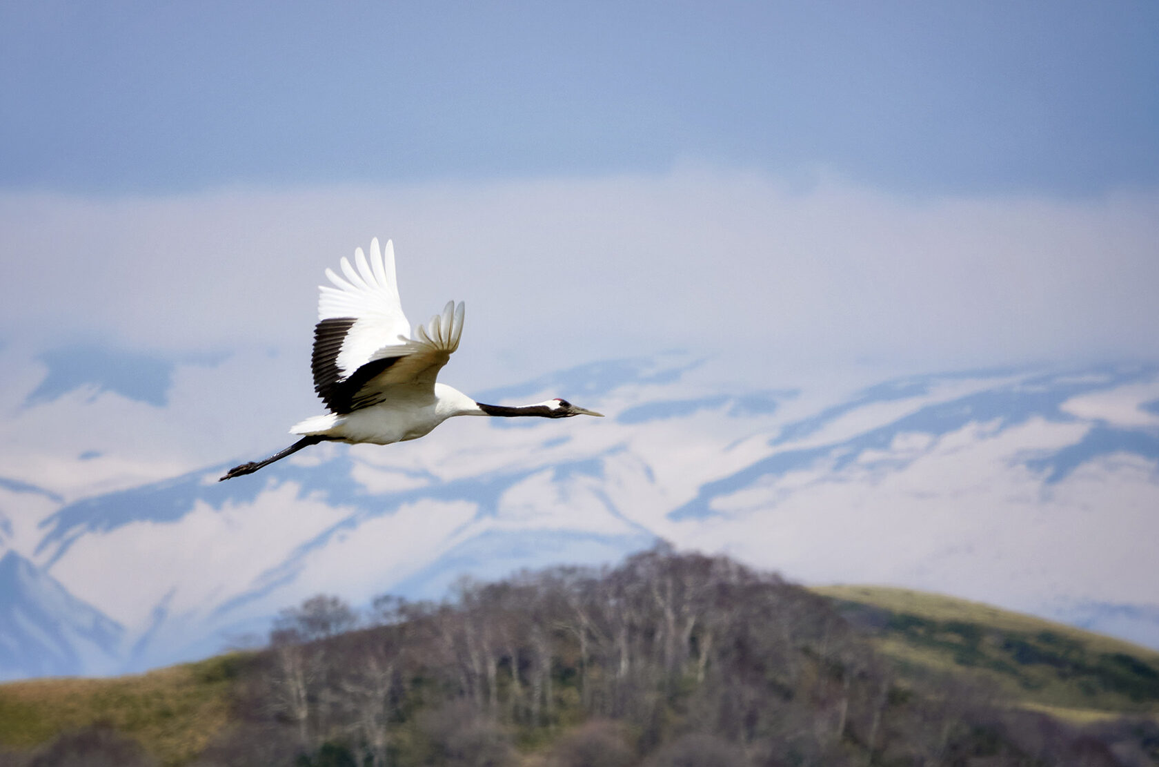 Японский журавль (Grus japonensis), летящий над Кунаширом. 13.05.2025. Автор фото: Александр Драгун.