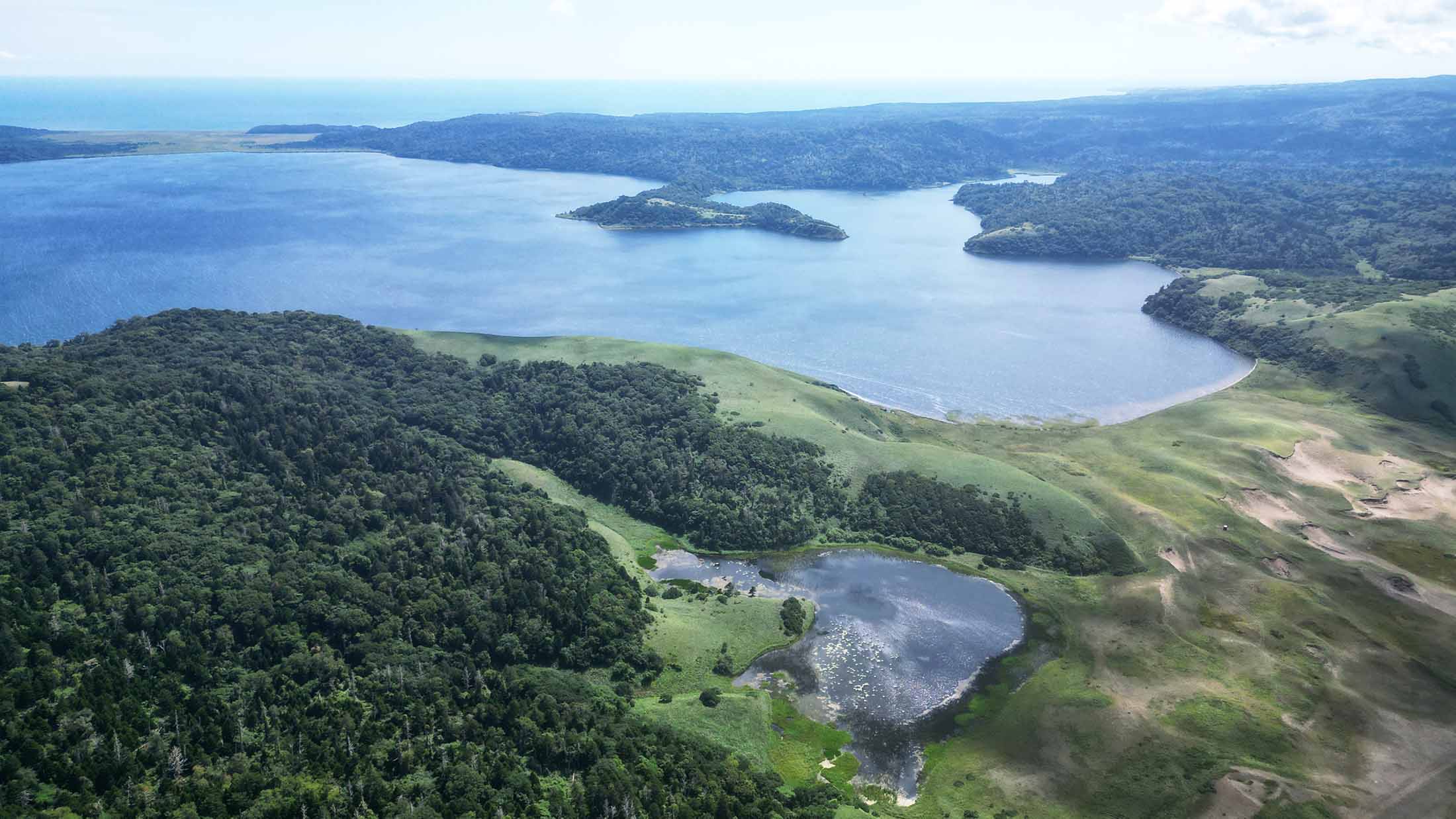 Вид сверху на озера Медвежье и Песчаное, о. Кунашир. 22.08.25. Автор фото: Михаил Рагимов.