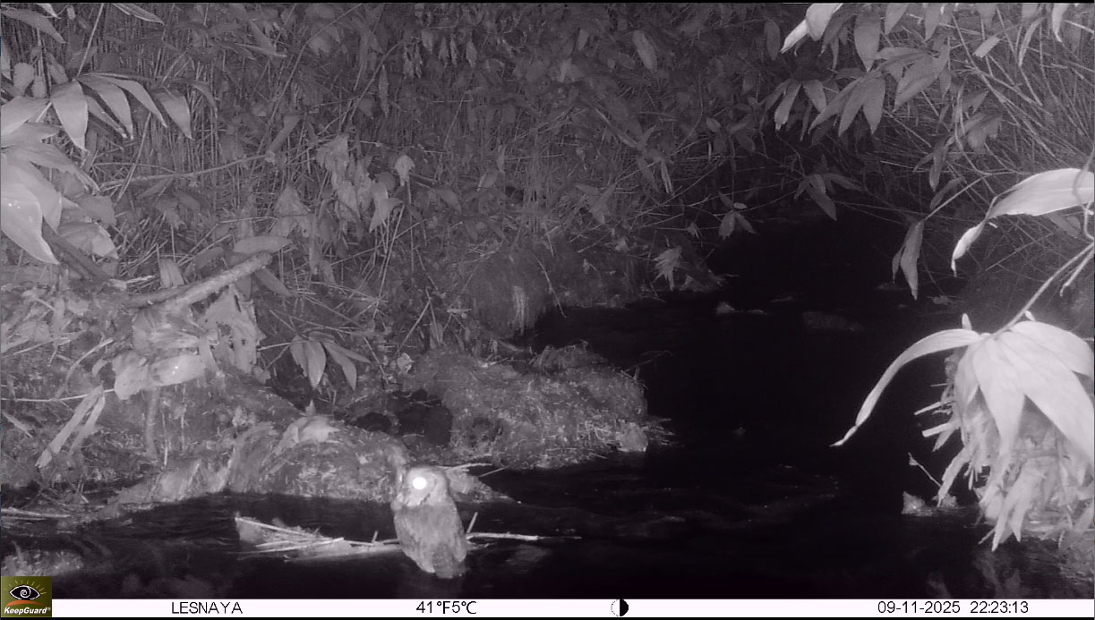 И для сравнения самая большая сова Южных Курил – рыбный филин на фотоловушке заповедника "Курильский". Остров Кунашир. 12.11.2025